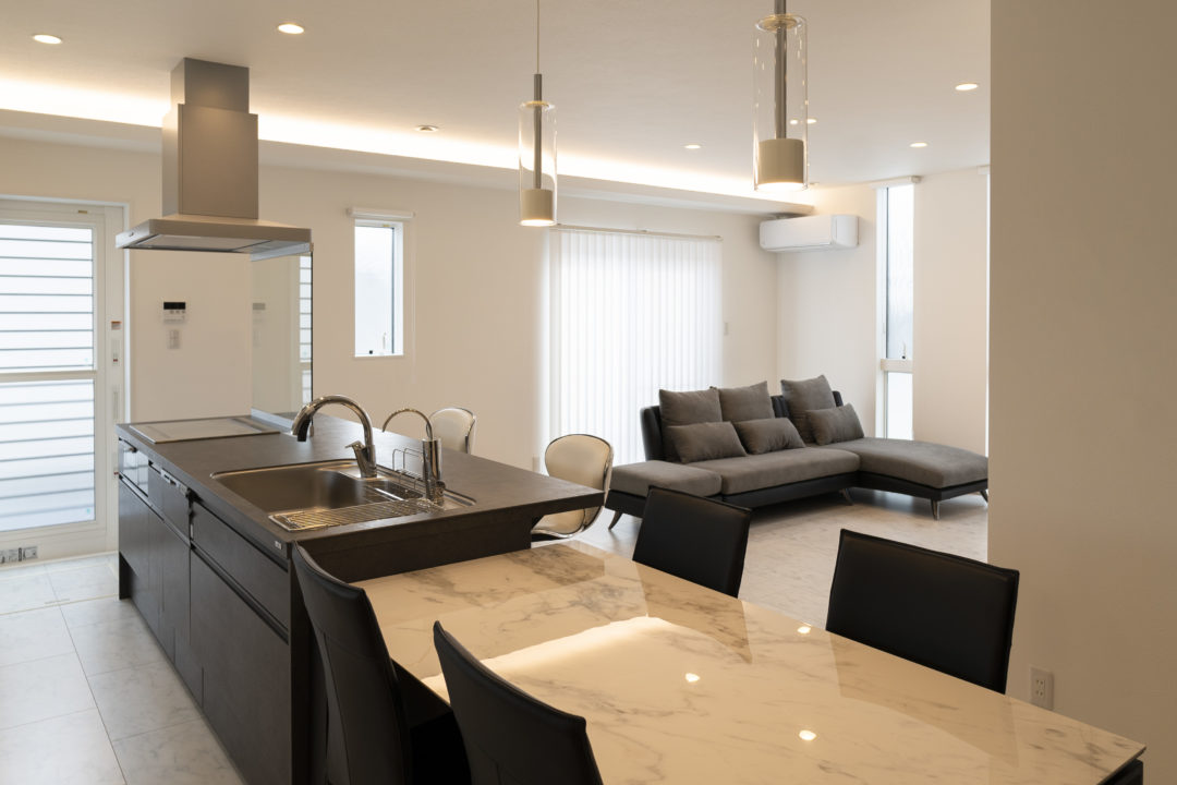 白を基調としたリビングは、照明により部屋の雰囲気が一変。