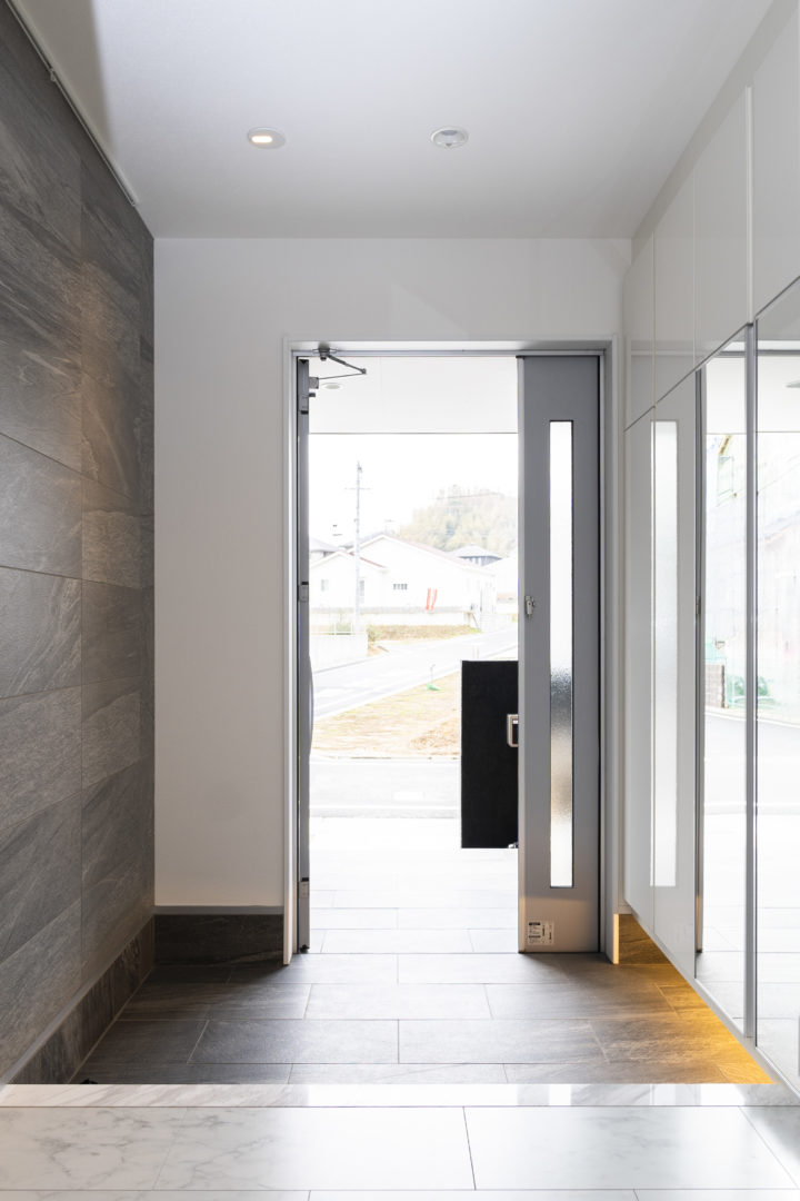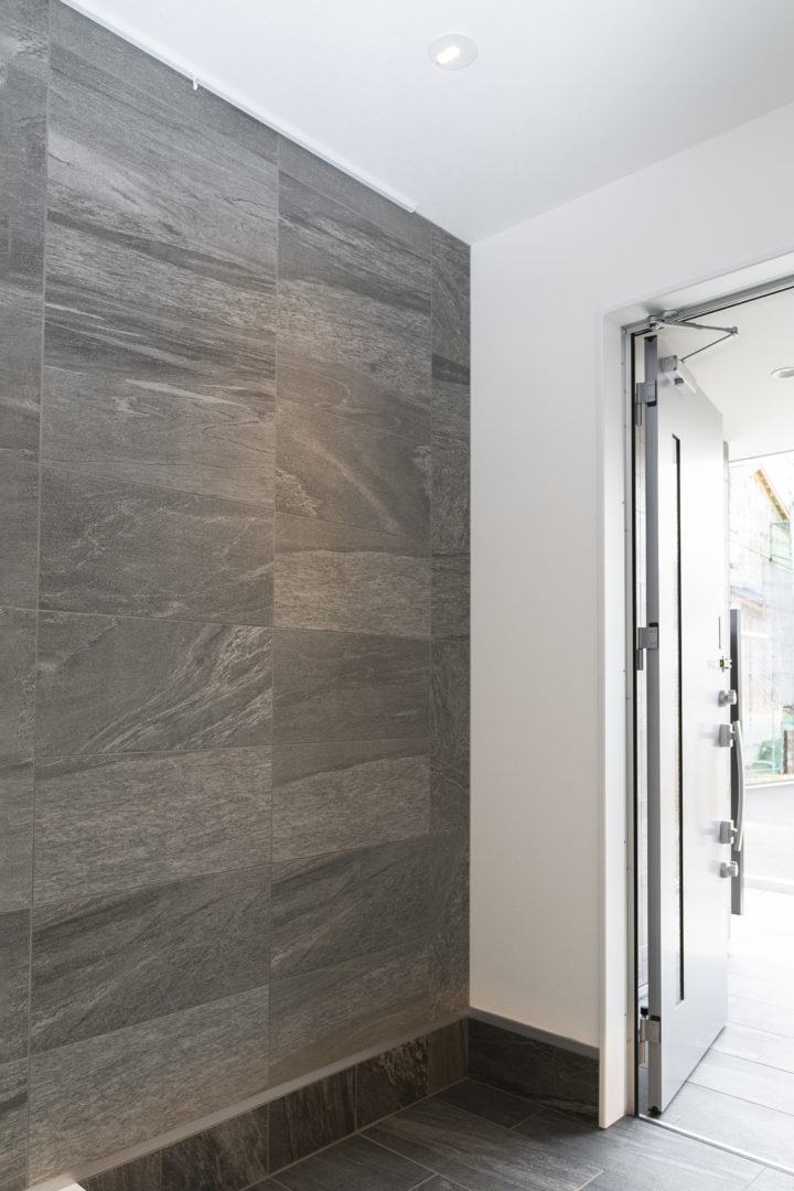 明るい玄関に入るとお客様のこだわりの石材を使った壁がお出迎え