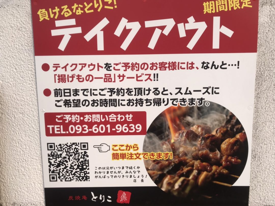 こだわりの本格焼き鳥から、子供たちにも大人気の変わり種焼き鳥で人気のとりこさんですが、現在、折尾本店と則松店でテイクアウト販売を行っているそうです。