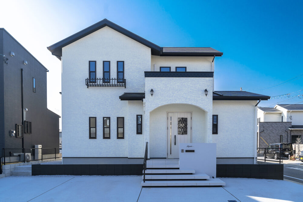 favorite_border お気に入りに追加白を基調としたヨーロッパスタイルの外観。玄関アプローチやサッシはシンプルモダンテイストを取り入れ甘くなりすぎないスッキリとした印象に仕上がりました。