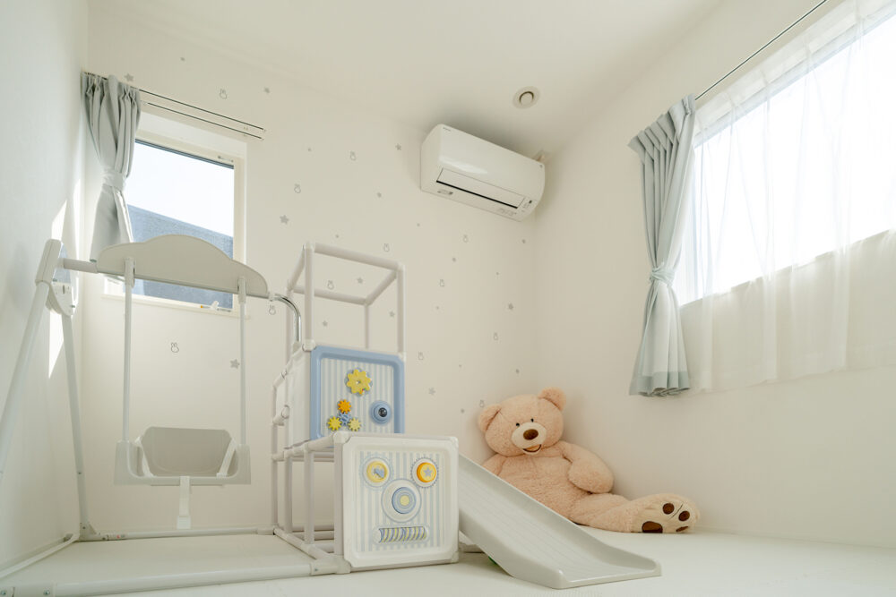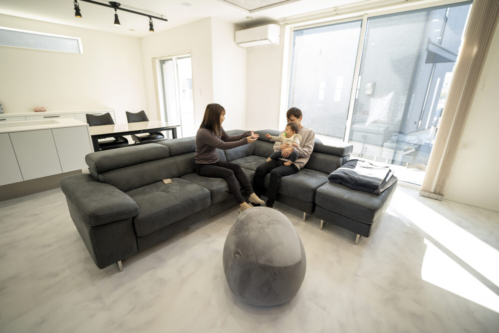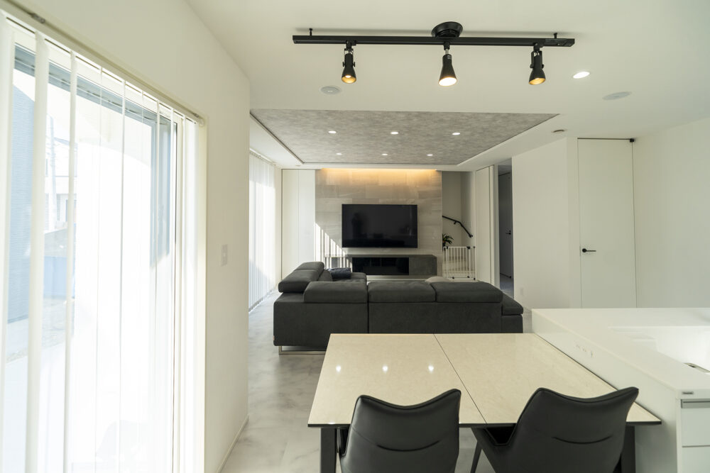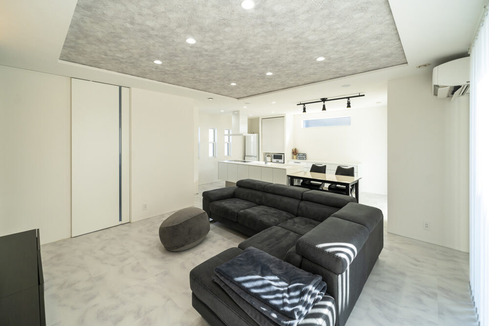 明るい光が注ぐ南側のLDKは白のフロアタイルにすることで、より一層空間全体を眩くつつみます。アクセントウォール、折り上げ天井は、落ち着いたグレイッシュな色見で空間全体をやさしく引き締めます。