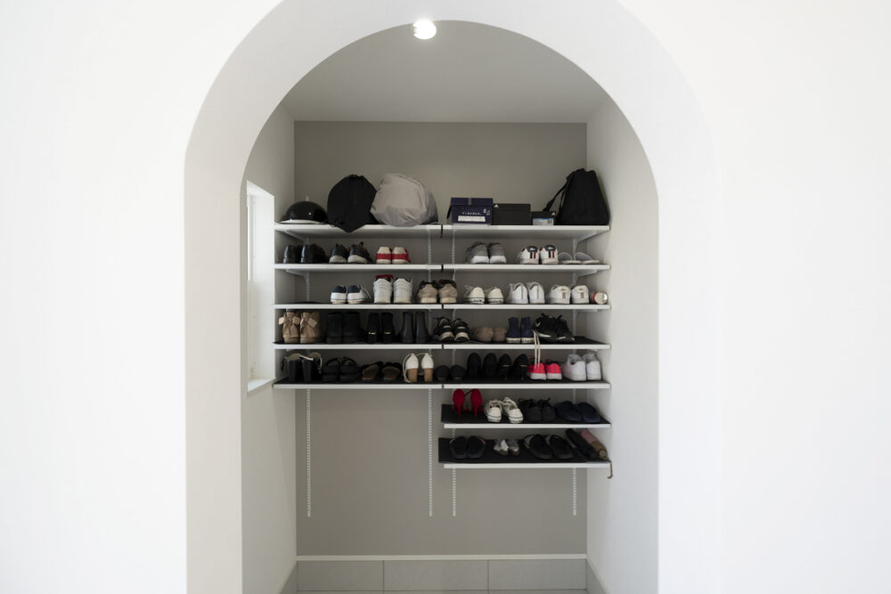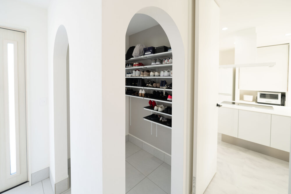 玄関を開けると、大容量のウォークスルータイプのシューズクローク。家族用と来客用で玄関の動線を分けられて、玄関をすっきり綺麗に保ちやすくします。