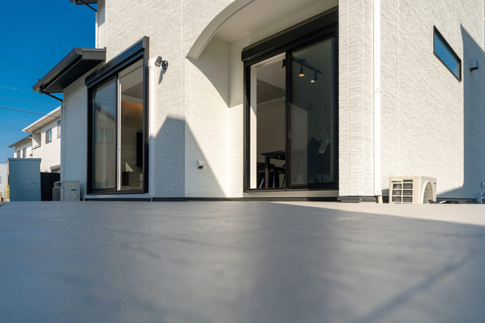 LDKを一歩外に出ると、アウトドアリビングとして活躍できる広々としたタイルテラス。屋外のアーチの開口部が、ヨーロピアンな雰囲気を演出してくれます。