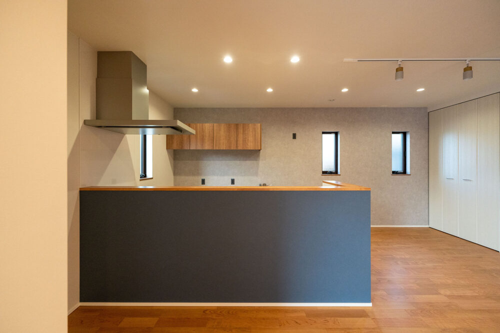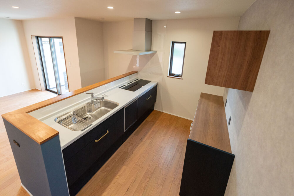 favorite_border お気に入りに追加こだわりは、なんといってもキッチン。Panasonicラクシーナ×造作カウンターで、機能性と美しさを兼ね備えたキッチンになりました。ブルーグレーの造作カウンターでリビング側からの目線はきりながらも料理をしていてもリビングが見渡せるペニンシュラ型を採用。キッチンの高さは、奥様の身長に合わせて90cmにカスタマイズしています。カップボードもこだわりの一つです。キッチンパネルと統一感のあるネイビーオーク柄とアクセントとなるダークゴールドのハンドルで品がありながら暖かな印象になりました。吊戸棚は、ナチュラルチェリー柄に。リビング側から見ても温かな雰囲気で違和感なく溶け込みます。