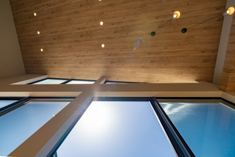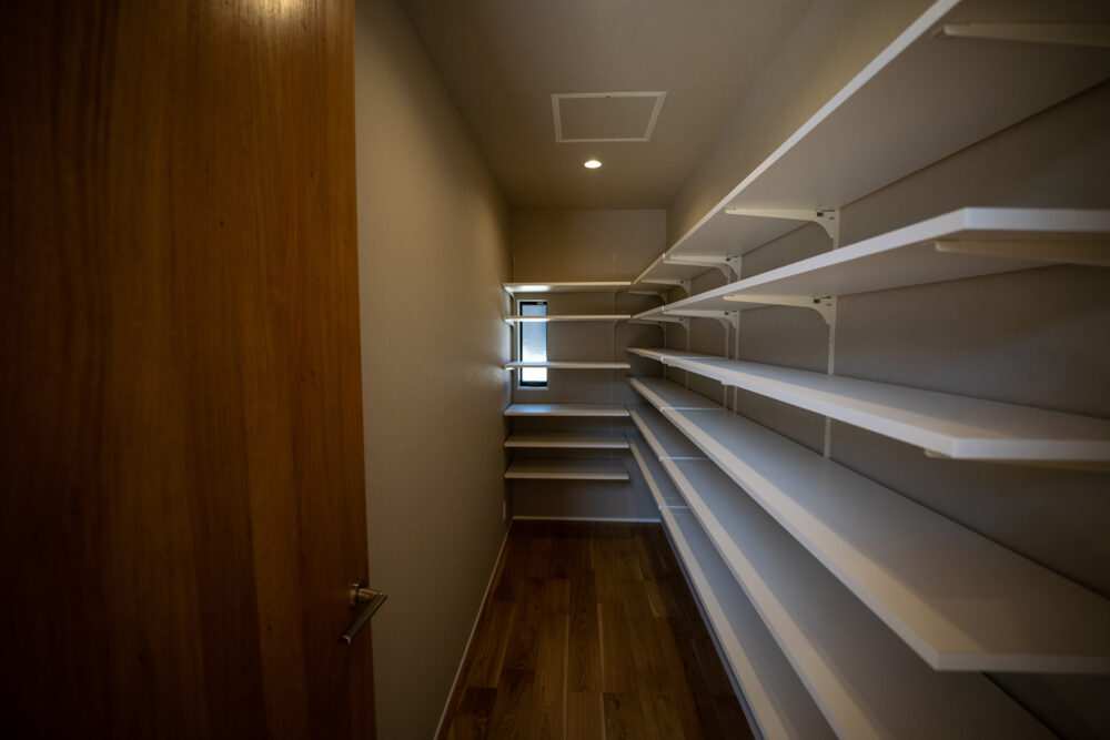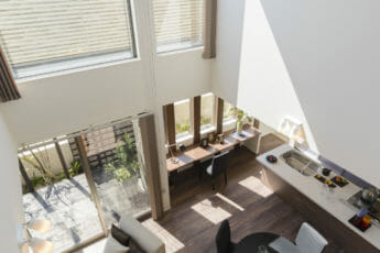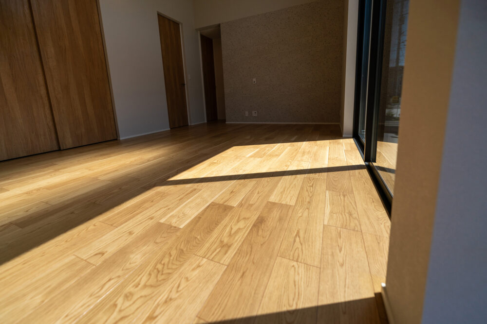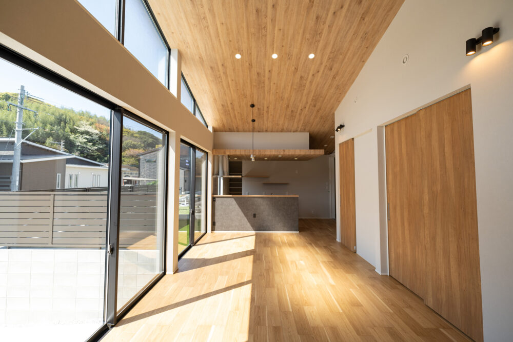 耐震SE構法を取り入れることで、地震、台風に対する安全性にも配慮しながら、開放的な空間を実現しました。南側に設けた天井までの全面窓は、室内を自然光で満たし、明るい雰囲気を演出します。また、Kamiyaのフルハイトドアを採用することで、さらに空間の広がりを感じられる設計となっています。