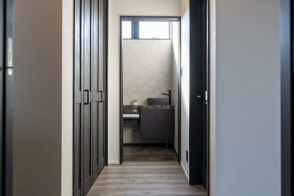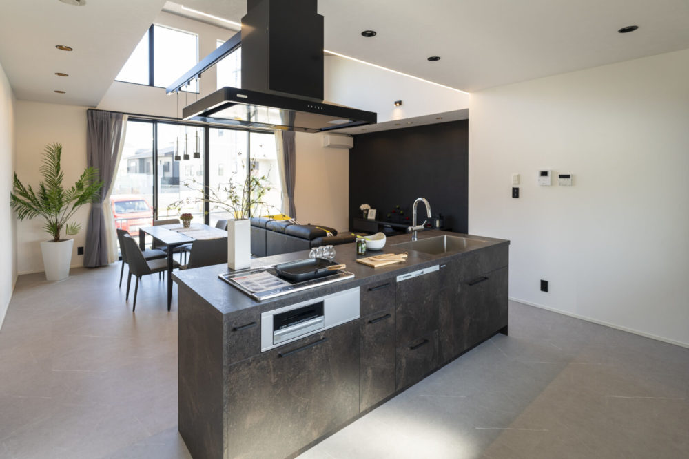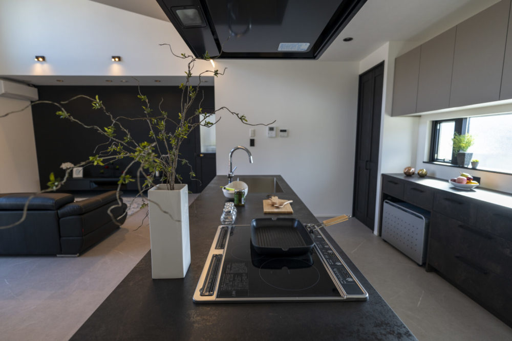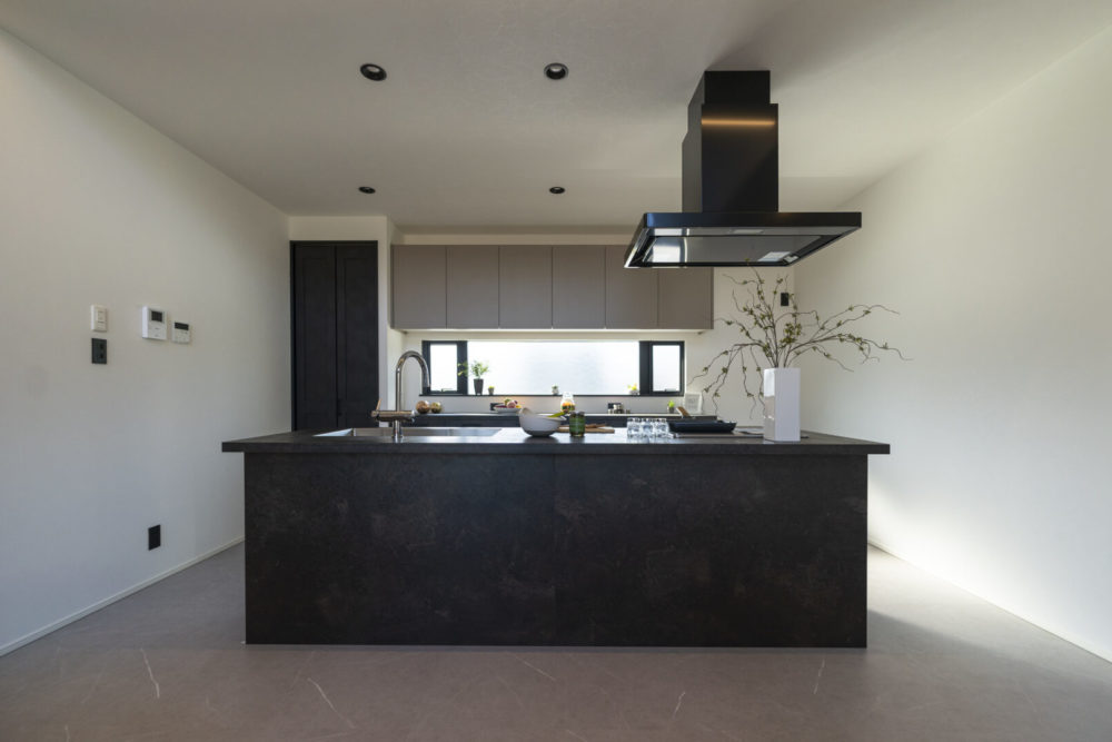 キッチン・キャビネットはセラミックタイルのような深みのある質感が楽しめるGRAFTEKT(グラフテクト)社製アイランドキッチン。キッチン背面のスペースはキャビネットまで約1メートルとご家族が一緒に料理をしても、ゆとりのある設計。