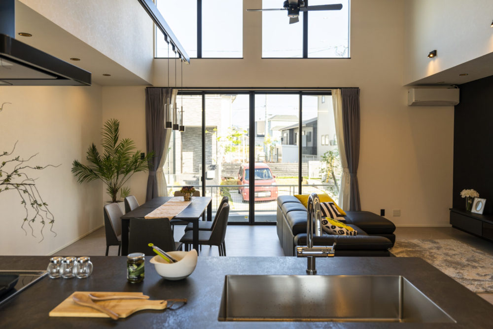 最高天井高4.3m。縦方向にも横方向にも空間が広がる25帖のLDKが圧巻の平屋です。